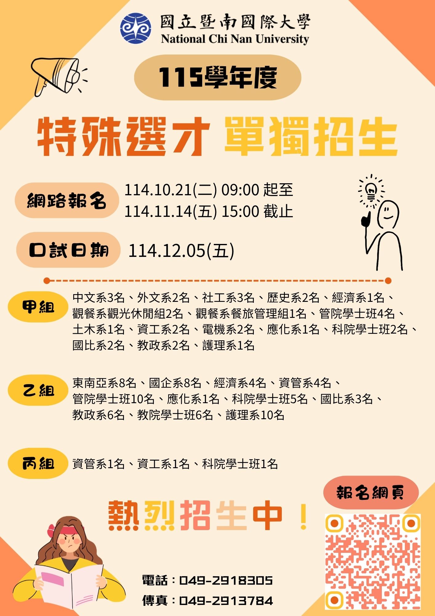 【試務組】國立暨南國際大學115學年度特殊選才單獨招生訊息